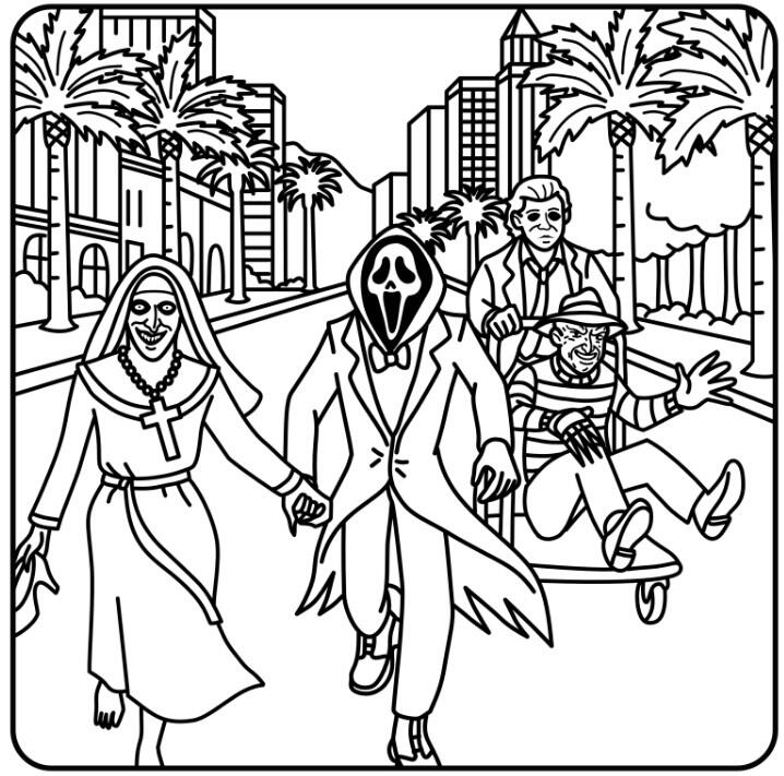 Part story, part coloring therapy — a blood-soaked parody you’ll never forget.💀