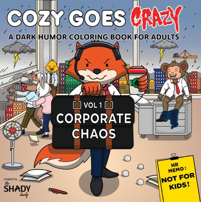 Cozy Goes Crazy: Corporate Chaos is a darkly funny, stress-relieving, office humor coloring book — featuring 34 absurd scenes where cute animals take on corporate clichés, cozy crime scenes, ironic mishaps, and the daily grind with a twist of mayhem.Watch a duck expense a night at a strip club on the company...and then face the consequences. Color a bunny in labor while still hitting KPIs, and witness employees spiral into madness when the office coffee machine breaks - all illustrated in an adorably unhinged style.